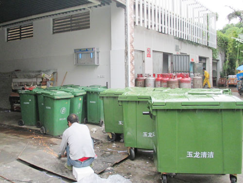 工人在為垃圾容器房消毒。