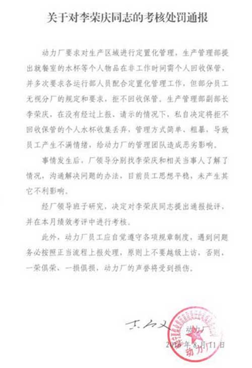 動力廠一名工作人員提供的一份《關(guān)于對李榮慶同志的考核處罰通報》顯示,該廠生產(chǎn)管理部提出就餐室的水杯等個人物品在非工作時間由個人回收保管,但部分員工無視此規(guī)定和要求,拒不回收保管。李榮慶在沒有經(jīng)過上報請示的情況下,私自決定將拒不回收保管的個人水杯收集丟棄,管理方式簡單粗暴,導(dǎo)致員工產(chǎn)生不滿情緒,給動力廠的管理團(tuán)隊造成惡劣影響。
