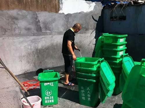 前天上午8點(diǎn),金棉小區(qū)廢棄籃球場的東南角就響起了一陣陣沖洗聲,清潔人員劉師傅拿著水管沖洗著一只只垃圾桶,邊上一排晾著幾十只剛洗干凈的垃圾桶。這些垃圾桶都是早上從小區(qū)里收集來的,洗干凈晾干后,第二天去替換其他臟的垃圾桶。